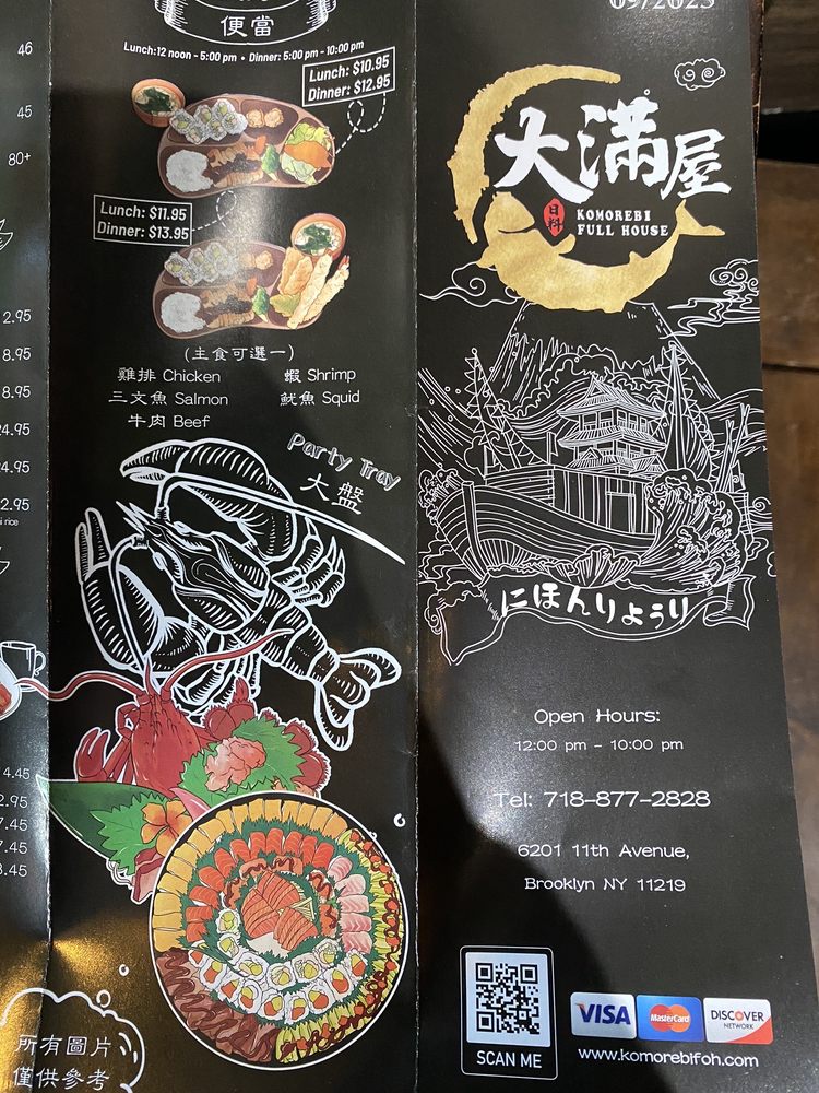 Introducing the menu at Komorebi Full House, a hidden gem sushi bar in Brooklyn, NY. The menu boasts a variety of soups like Miso Soup and Seafood Soup, salads including Seaweed and Avocado Salad, and appetizers like Gyoza and Takoyaki. Customers rave about the fresh and high-quality sushi, with standout dishes like the uni sushi and special rolls. The ambiance is pleasant, service is quick, and the staff is friendly. Perfect for a casual dinner or group gathering, Komorebi Full House offers a great selection of vegetarian options and party trays for sharing. Don't miss out on the well-kept establishment and reasonable pricing that has locals coming back for more. If you're a sushi lover, this neighborhood spot will hit the spot for sure.